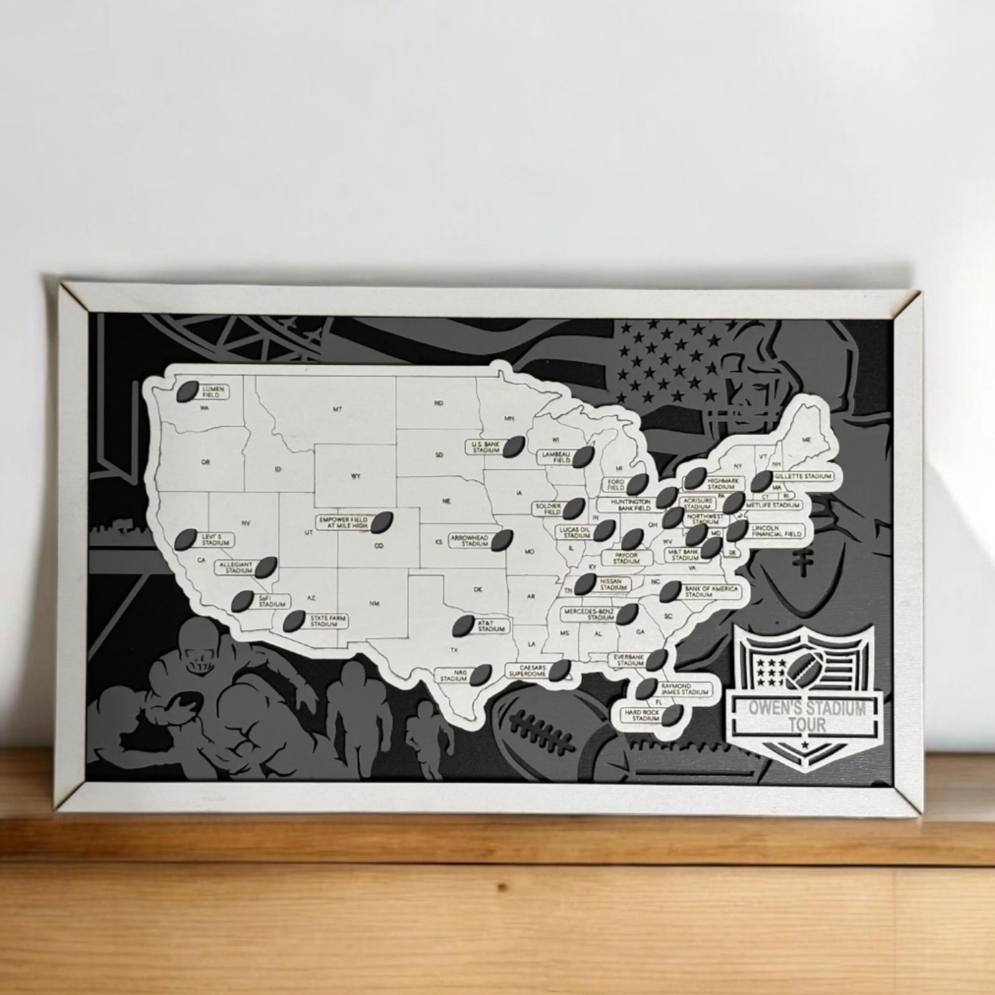 Celebrate every kickoff, touchdown, and tailgate with our Football Stadium Tracker Map. Perfect for die-hard fans and football families, this handcrafted wood map helps you mark each stadium you've visited with included football icons. Choose from a team-inspired painted background or a rich walnut stain to suit your style. Whether it's a gift or a personal keepsake, this map is a winning addition to any fan’s decor.
