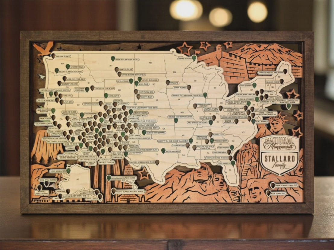 National Monument Map Tracker – Wooden USA Travel Wall Art, Laser Cut & Engraved