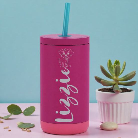 The New Engraved Kids 12oz Stainless Steel Sip Tumbler is designed for everyday adventures, school days, and fun on the go. Each tumbler features a permanently engraved name and icon design, creating a playful yet durable look that won’t peel, fade, or wear off.