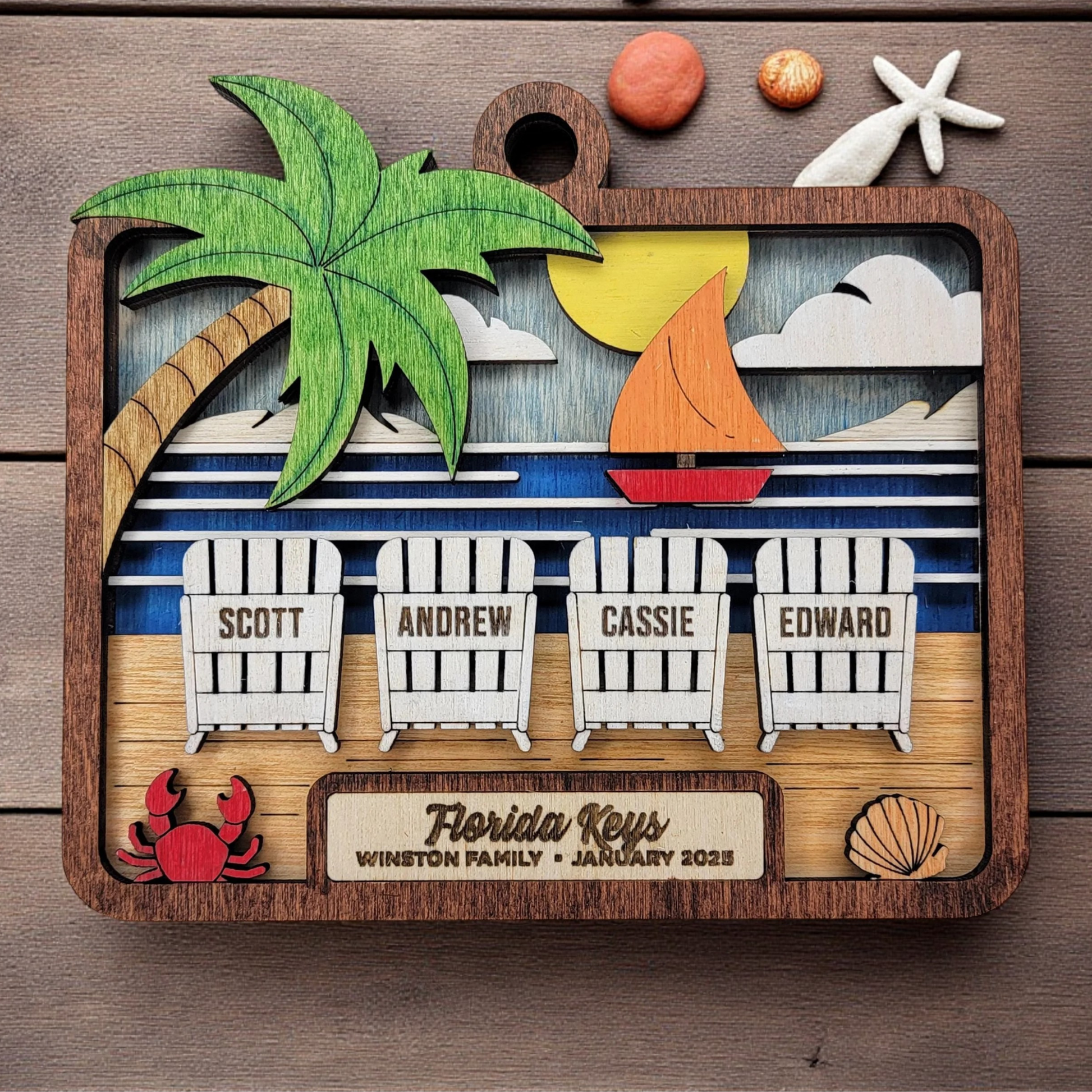 Capture the joy of your family getaway with this beach vacation memory ornament—a handmade keepsake that brings coastal vibes to your holiday décor. Each 4-inch ornament is laser cut and engraved from premium woods in our Ohio boutique, then hand-painted with care to create a one-of-a-kind treasure. Perfect for remembering your family’s beach trip year after year.