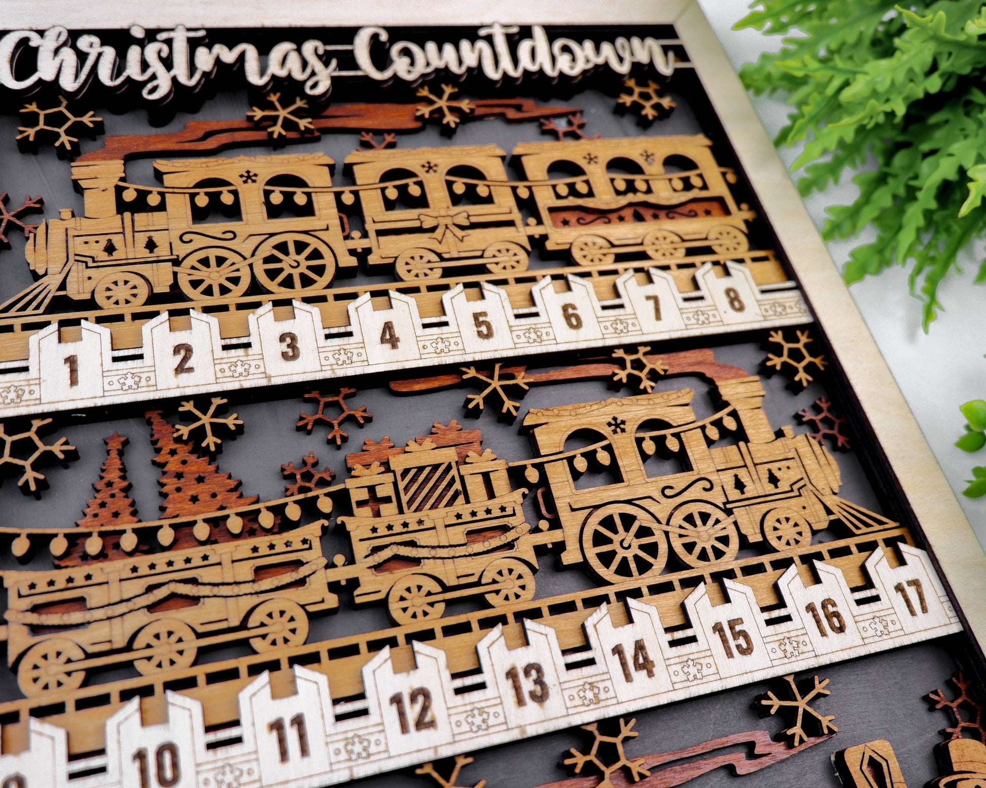 Personalized Christmas Countdown Sign – Custom Laser Cut Train in the Snow Wooden Advent Calendar (15x11)