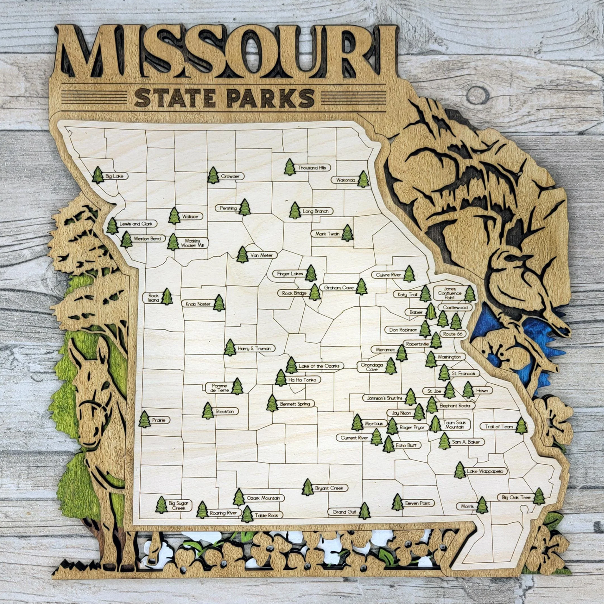 Celebrate your Missouri adventures with our handcrafted Missouri State Park Tracker Map. This beautiful wood wall art is laser engraved with all of Missouri’s state parks and includes pine tree icons so you can track each park you’ve visited. It’s a meaningful and interactive way to relive your favorite outdoor memories.