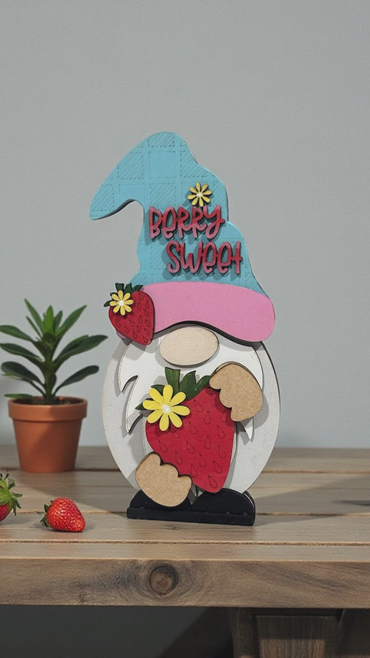Summer Strawberry Gnome Shelf Sitter – Interchangeable Outfit | Handmade Wooden Gnome Decor
